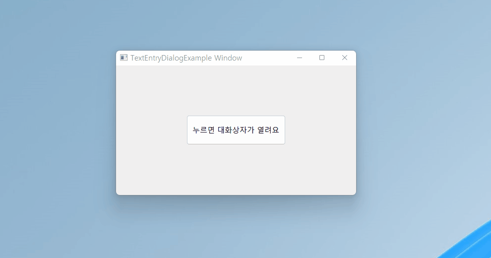 사용자로부터 한 줄 짜리 텍스트를 입력받는 텍스트입력다이얼로그(wx.TextEntryDialog)를 제작해보자. 다이얼로그는 대화상자 형태로 별도의 창이 열리게 되고 텍스트 입력란과 OK 혹은 Cancel 버튼을 놓을 수 있다.
