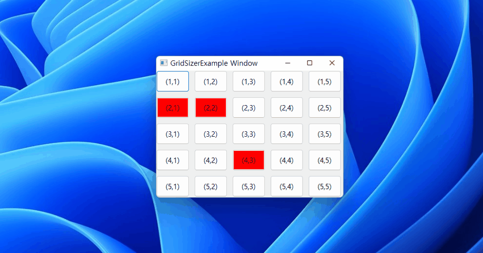 아래 예제는 5x5 그리드 사이저 생성 후 상하좌우 간격을 10으로 설정하고 25개의 버튼을 순서대로 배치하는 예제이다. 배치된 버튼은 self.grid.Children.Window 속성으로 소환할 수 있다.