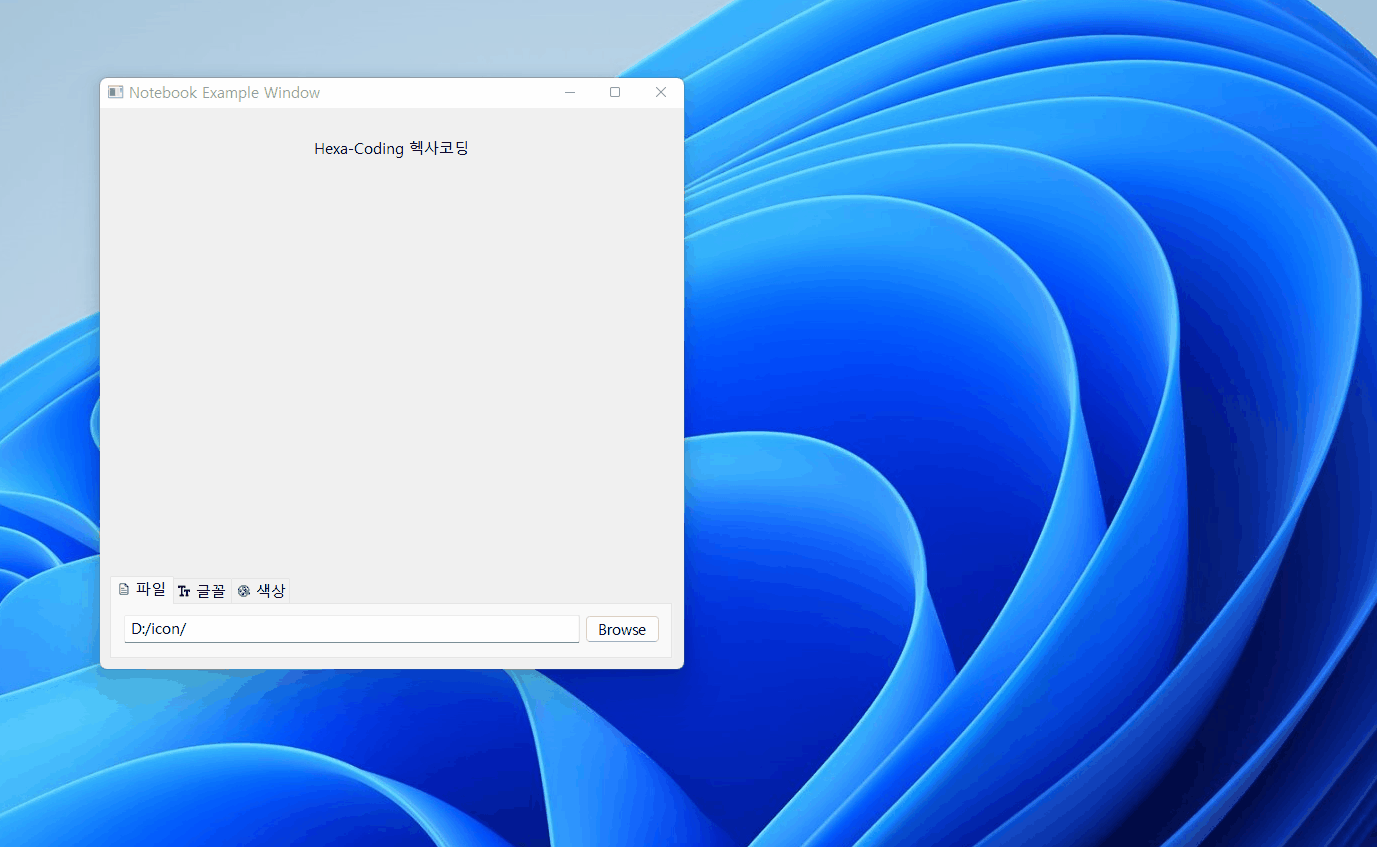 예제는 노트북(wx.Notebook)을 이용하여 파일선택컨트롤(wx.FilePickerCtrl), 폰트선택컨트롤(wx.FontPickerCtrl), 색상선택컨트롤(wx.ColourPickerCtrl) 세 개를 각각의 페이지에 담아 관리하는 모습을 보여준다. 노트북에 속한 각 페이지들을 어떻게 선언하고 관리하는지 예제를 통해 알아보자.