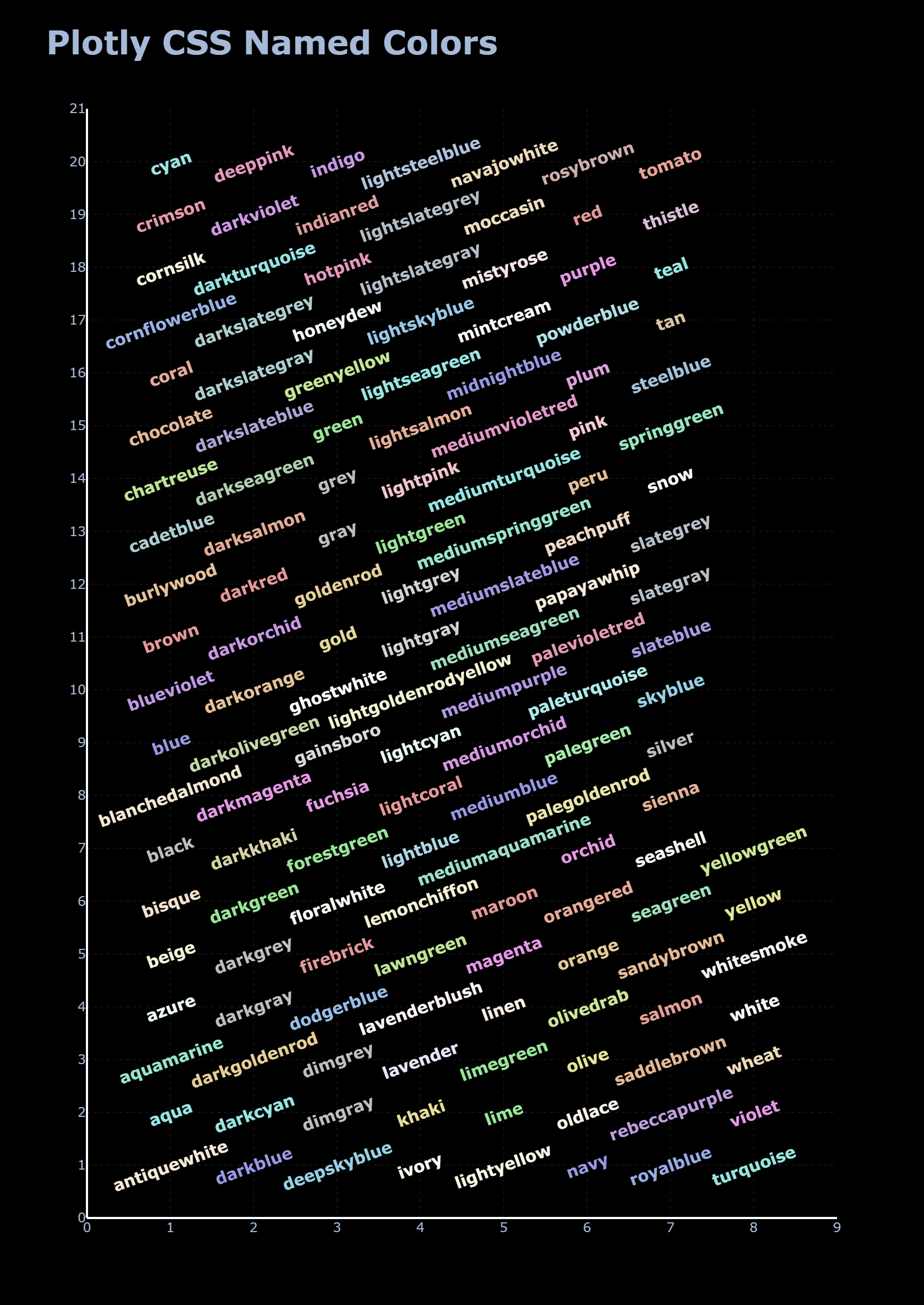 fig.update_layout(title=dict(text="<b>Plotly CSS Named Colors</b>", font=dict(size=30)),