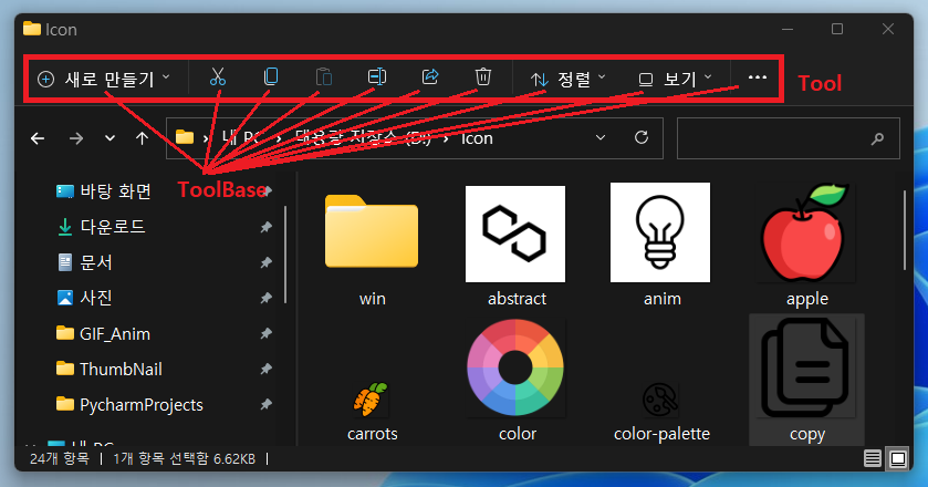 툴바(wx.ToolBar)는 여러 개의 툴베이스(wx.ToolBarToolBase)들로 이루어진다. 툴베이스란 툴바의 아이콘이라 생각하면 된다. 툴바에 아이콘이 4개 있으면 툴베이스가 4개 있는것과 같다.