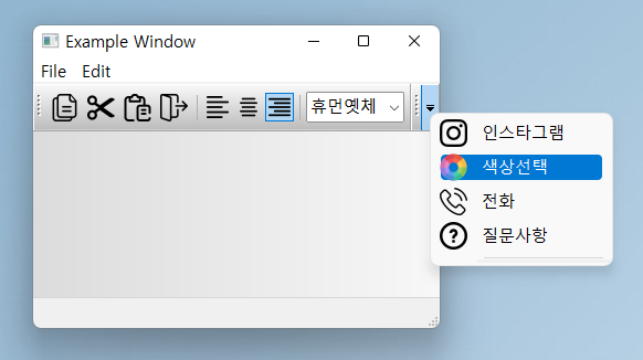 combo = wx.ComboBox(tb1, n_id, "(글꼴)", choices=["맑은고딕", "바탕체", "휴먼옛체", "굴림체", "궁서체"])