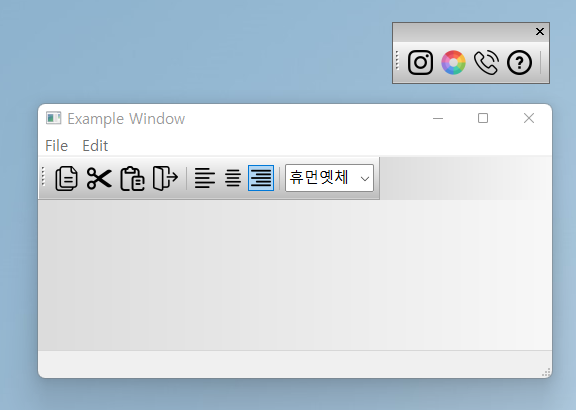 지난 번에 wxPython의 툴바(wx.ToolBar)에 대해 알아보았다. 이번에는 그보다 조금 더 세련되고 편리한 AuiToolBar(wx.lib.agw.aui.auibar.AuiToolBar)에 대해 알아본다. 예제에서는 AuiToolBar와 함께 AuiManager를 이용하여 툴바의 위치를 이리저리 바꿀 수 있고, 툴바에 컨트롤(wx.Control)도 넣을 수 있으며, 심지어 창 밖에서 Floating 하는 툴바를 생성하는 것을 만들어본다!
