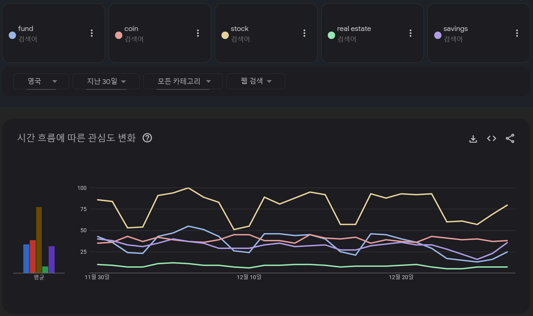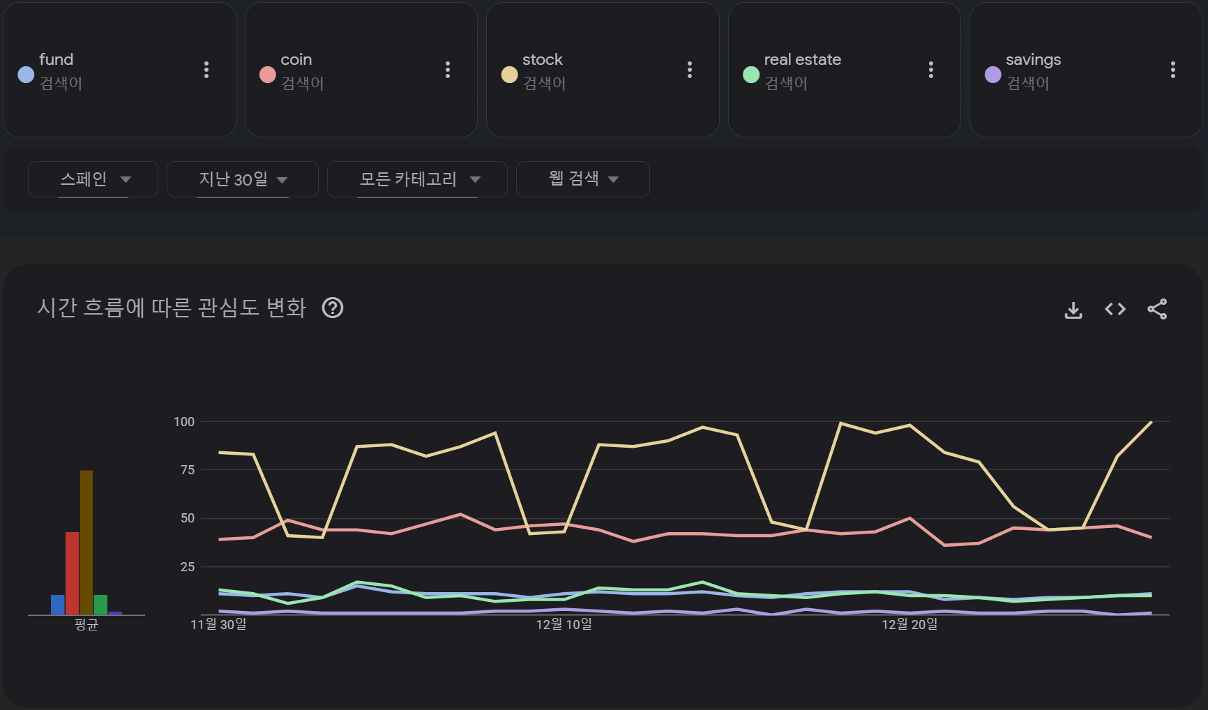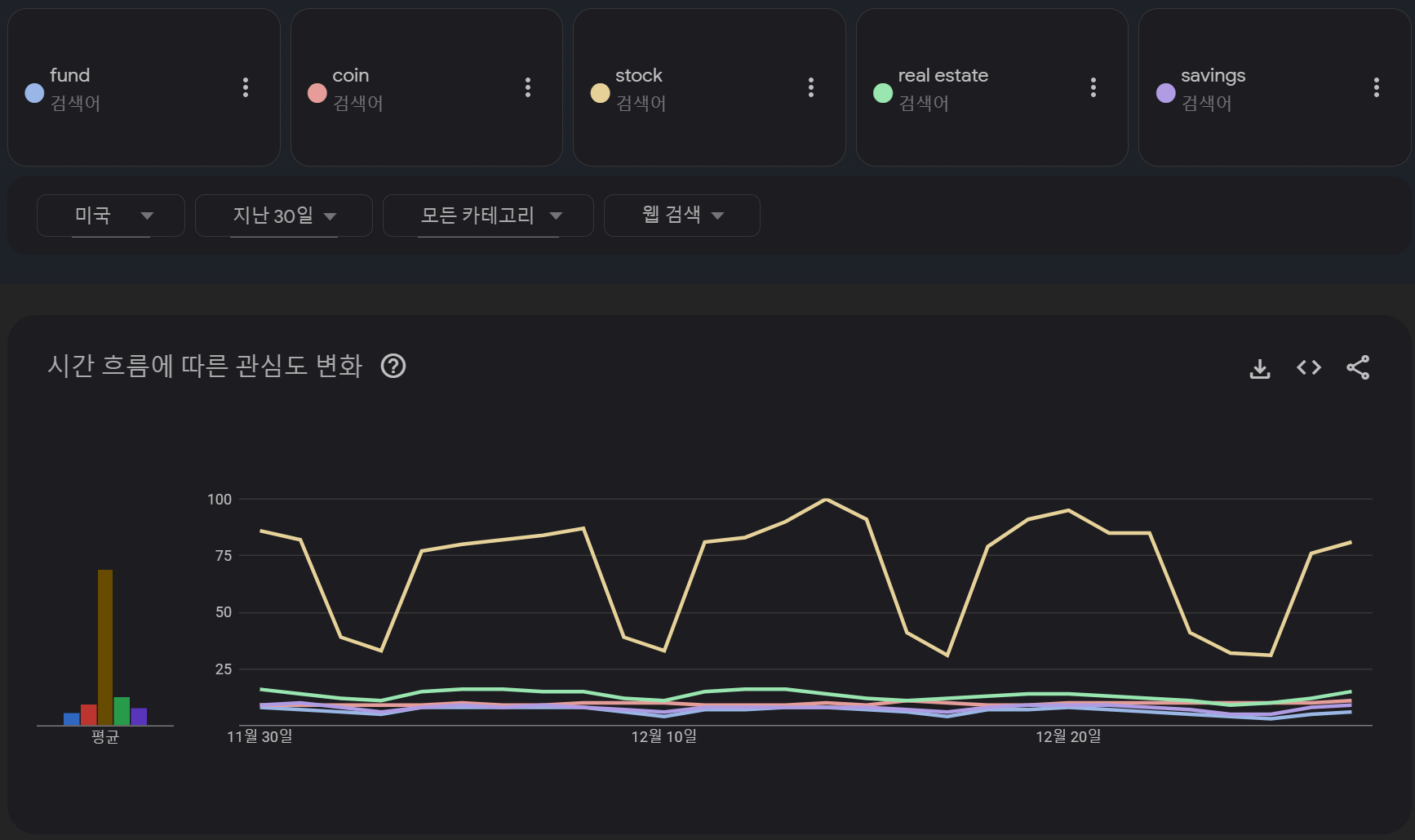 주식을 제외한 다른 재테크 수단들은 서로 거의 비슷 비슷한 검색량을 보여주는 것 같습니다.