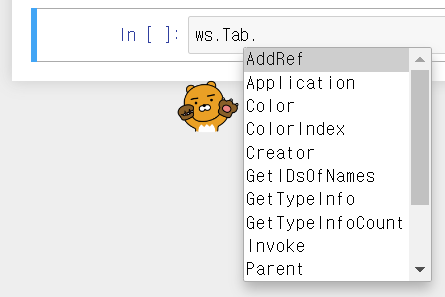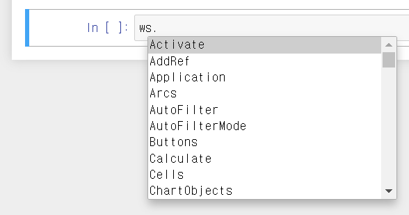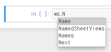 파이썬이 객체지향 프로그래밍을 지원하기 때문에 코드가 기억나지 않는다면 항상 클래스의 속성값을 바꿔준다고 기억해두면 좋다. 이게 무슨 뜻이냐면 아래와 같이 워크시트 객체 ws에 점을 찍고 탭을 누르면 ws 클래스 속성값들이 쭉 떠서 여기서 찾으면 된다.