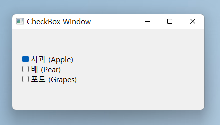 self.cb1 = wx.CheckBox(panel, -1, "사과 (Apple)", (20,50), (160,-1))