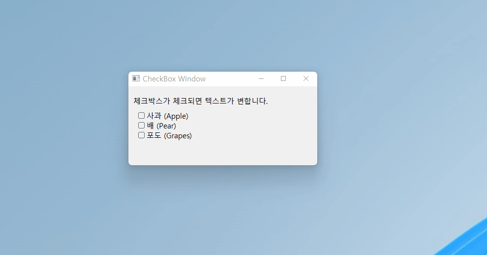 chkbox = wx.CheckBox(parent, id=wx.ID_ANY, label="체크박스라벨", pos=wx.DefaultPosition,